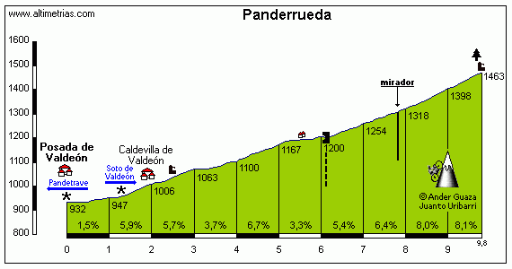 El Valle de Valdeón -"el más bello y hermoso que cabe soñar" en palabras del marqués de Santa Mª del Villar- se sitúa en el mismo corazón de los Picos de Europa que, por motivos puramente administrativos y nunca naturales (no hay nada menos natural que las fronteras) pertenece a la provincia de León, aunque los lugareños celebran todos los 8 de septiembre el día de la Virgen de la Corona, en recuerdo de la coronación de Don Pelayo como primer rey de la incipiente Reconquista desde tierras asturianas. Y en la misma capital del valle, Posada, se inicia nuestra ascensión a uno de los más privilegiados miradores que se pueden encontrar en estas tierras que tanto abundan en ellos. Para llegar hasta esta población sólo lo hemos podido hacer con esfuerzo y sudor, ya sea por el puerto de Pandetrave o, de manera aún más exigente, saliendo de lo más profundo del valle, donde se ubica Caín, la espectacular puerta de la "Garganta Divina del Cares". Si llegar hasta aquí ha sido duro también lo va a ser esta subida de casi 10 km que, a nada que las fuerzas no sean las suficientes, van a convertirse en un muro montañoso que se empeña en cerrarnos la salida. Pero como prometemos volver en más ocasiones quizás nos deje abandonar este paradisíaco valle con ese compromiso de retorno. El primer kilómetro nos sirve para ir ganando confianza de que culminaremos la empresa que nos aguarda hasta que poco antes de llegar a Caldevilla ya empezamos a sentir las primeras muestras de que no va a ser cosa fácil. Alguna rampa al 9% nos sirve de primer aviso de que la cosa va en serio, aunque la pendiente media no alcance todavía el 7%. El trazado se mantiene rectilíneo hasta el fondo del valle, para acabar atravesando una vaguada con puente que nos cambia al flanco opuesto para continuar ascendiendo con calma y concentración el tramo definitivo del puerto. Con mayores dificultades ahora, alcanzamos el Mirador de Valdeón, desde el que contemplamos espectaculares vistas del macizo Occidental y Central de los Picos de Europa, con los pueblos acurrucados en el fondo del valle. Este espléndido panorama va a hacer que detengamos nuestra marcha, lo que además nos servirá de descanso reparador para afrontar la zona más dura de la ascensión. Esos dos kilómetros finales constituyen por sí solos el verdadero intríngulis de este puerto, ya que alguna rampa supera con claridad los dos dígitos -palabras mayores a estas alturas- mientras, desde lo alto, el collado al que queremos acceder parece invitarnos a continuar en nuestro esfuerzo, lo que no nos va a resultar sencillo ni mucho menos. En el alto del puerto de Panderrueda hallaremos un Área Recretiva y una explanada, de donde sale el camino que se dirige al mirador de Piedrashitas. Todo el conjunto que dominamos desde esta singular atalaya - el valle, los bosques, los pueblos, y especialmente los macizos - nos hacen sentir la grandeza de este entorno montañoso.